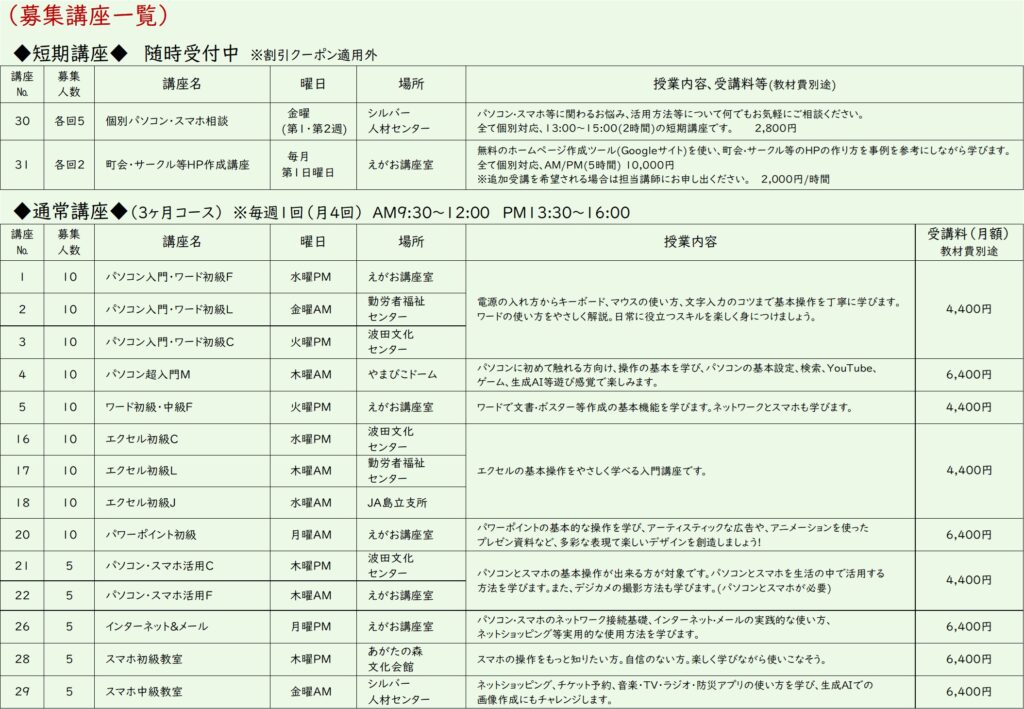 このたび、シニアパソコン教室では春期の受講生を募集いたします。